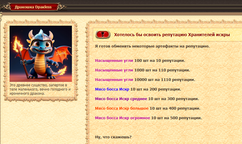 Или меняем Насыщенные угли, мясо у дракошки на репутацию.