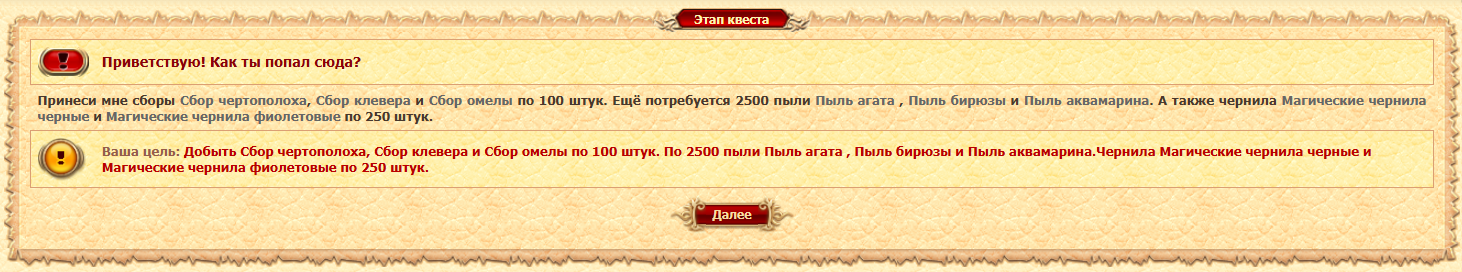 Текущая цель: Добыть Сбор чертополоха, Сбор клевера и Сбор омелы по 100 штук. По 2500 пыли Пыль агата , Пыль бирюзы и Пыль аквамарина.Чернила Магические чернила черные и Магические чернила фиолетовые по 250 штук.